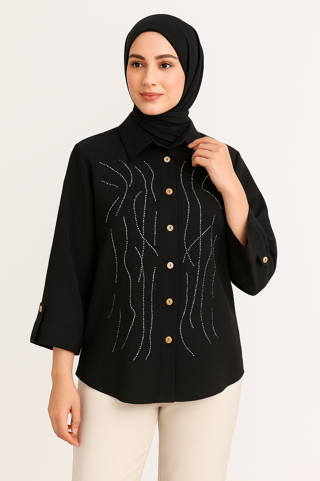 شومیز زنانه نگین دار مدل آستین سه ربع پارچه شانتون